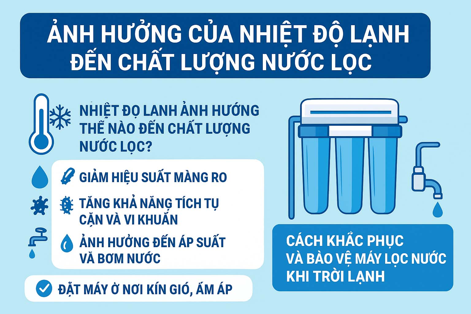 Ít ai biết rằng, nhiệt độ lạnh có thể ảnh hưởng trực tiếp đến chất lượng nước lọc, khiến máy hoạt động kém hiệu quả, nước chảy yếu hoặc thậm chí không đảm bảo độ tinh khiết như thông thường.