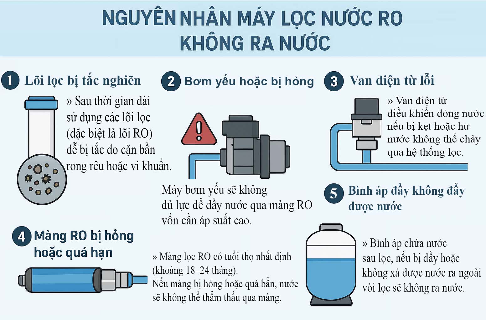 » Điều này khiến nước không thể đi qua màng lọc, dẫn đến tình trạng không có nước ra vòi.