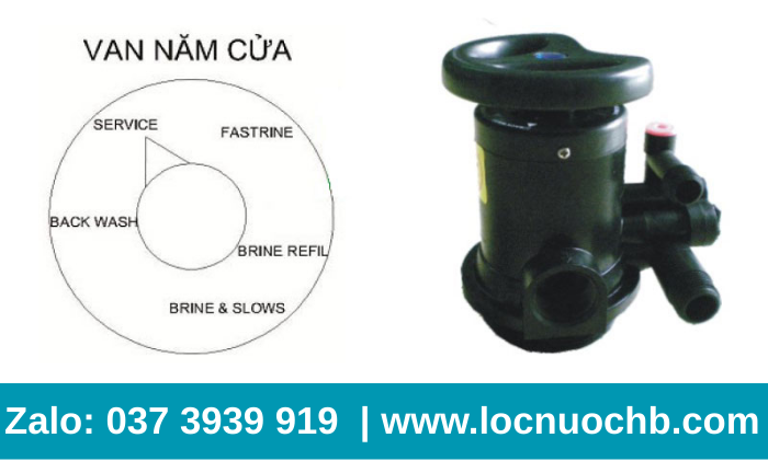 Van cơ 5 cửa thường dùng cho cột làm mềm (hạt Cation), khử khoáng. Ngoài các chế độ rửa còn có hoàn nguyên bằng muối (tái sinh hạt nhựa trao đổi ion).