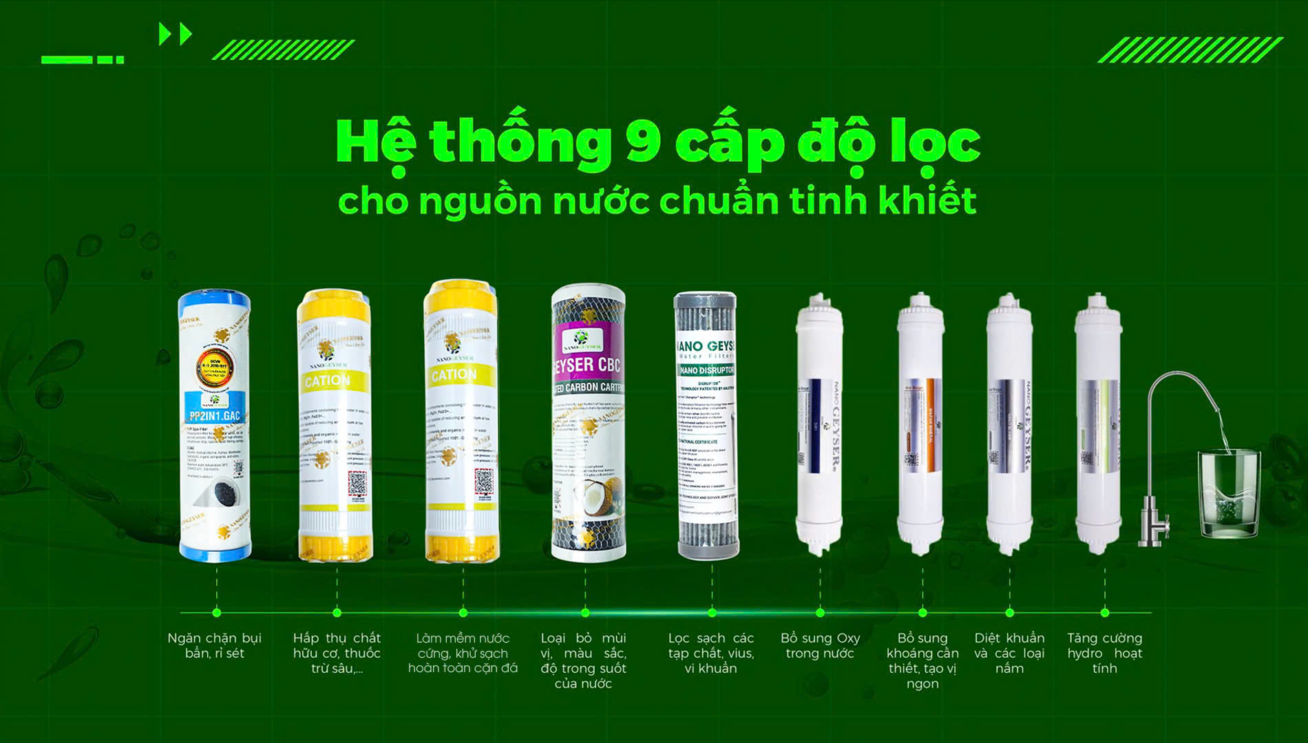 » Lõi lọc số 9 Hydrogen: Tăng cường hydro hoạt tính trong nước. Mang đến tác dụng chống Oxy hoá cho cơ thể khi hấp thụ lượng nước này vào cơ thể, làm giảm thiểu các triệu chứng mệt mỏi, căng thẳng, cải thiện tình trạng hệ tiêu hóa, đẩy lùi các bệnh tật do các gốc tự do trong cơ thể tạo ra. Tạo ra các ion kiềm làm tăng pH của nước lên đến 8.5 , chính vì thế mà nó làm cân bằng pH trong cơ thể, giảm các triệu chứng do axit trong cơ thể gây ra như giảm đau dạ dày, mệt mỏi, ợ hơi chua, đầy bụng,..