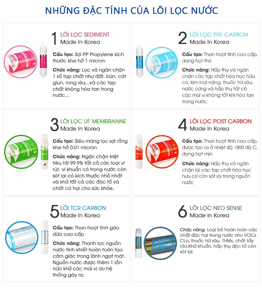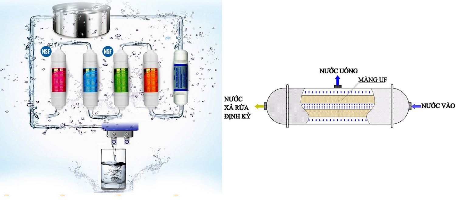 Với hệ thống 6 lõi lọc được thiết kế nguyên khối, theo quy trình khép kín, đặc biệt là sử dụng màng siêu lọc UF đem lại cho người dùng nguồn nước tinh khiết mà vẫn giữ nguyên khoáng chất, nước đạt tiêu chuẩn nước uống trực tiếp do Bộ Y Tế quy định.