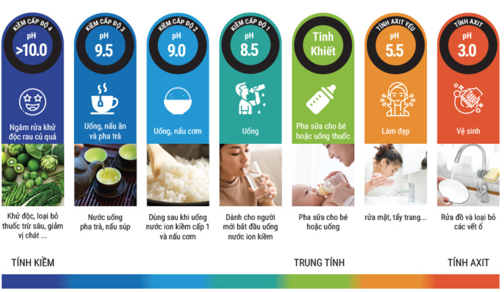 » Nhiều cấp độ pH linh hoạt: Cung cấp 5 mức nước kiềm (pH 8.5 - 9.5), nước trung tính (pH 7.0) và nước axit (pH 5.5 - 6.5), đáp ứng đa dạng nhu cầu từ uống, nấu ăn, rửa thực phẩm đến làm đẹp.