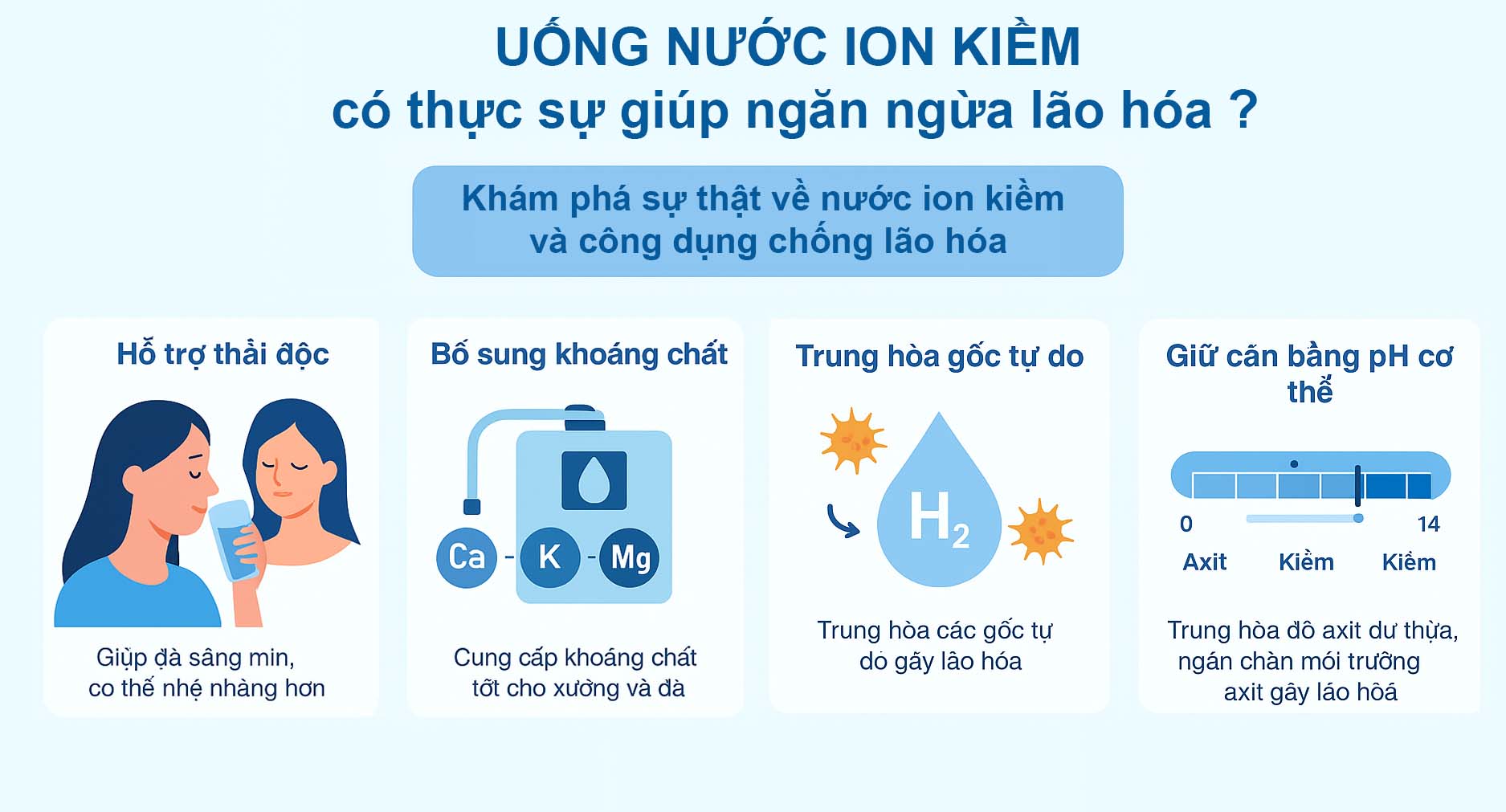 Uống nước ion kiềm có giúp chống lão hóa? Khám phá cơ chế trung hòa gốc tự do, giữ cân bằng pH, bảo vệ tế bào và duy trì sức khỏe lâu dài.